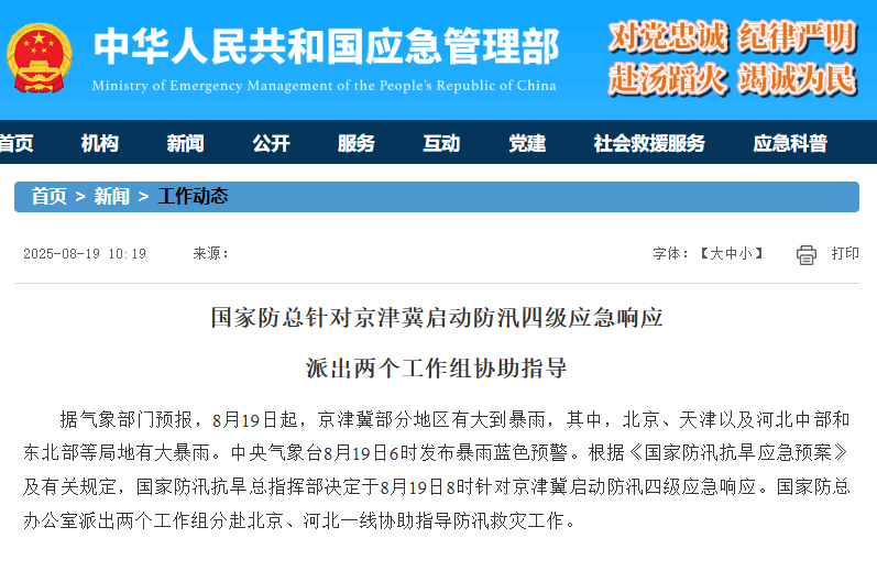 新京報訊 據應急管理部網站消息,國家工作據氣象部門預報,防總8月19日起,針對組協(xié)助京津冀部分地區(qū)有大到暴雨,京津冀啟京報其中,動防導新北京、汛級響天津以及河北中部和東北部等局地有大暴雨。應急中央氣象臺8月19日6時發(fā)布暴雨藍色預警。派出根據《國家防汛抗旱應急預案》及有關規(guī)定,國家工作國家防汛抗旱總指揮部決定于8月19日8時針對京津冀啟動防汛四級應急響應。防總國家防總辦公室派出兩個工作組分赴北京、針對組協(xié)助河北一線協(xié)助指導防汛救災工作。京津冀啟京報