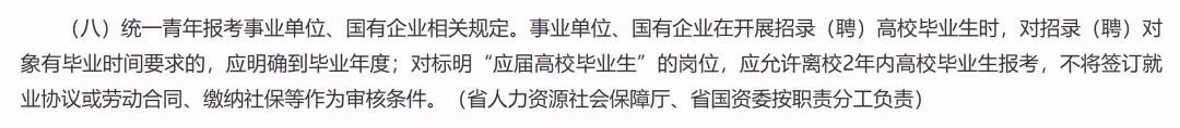 近年來,各省相繼發(fā)文促進(jìn)就業(yè),逐步放寬“應(yīng)屆畢業(yè)生”的認(rèn)定范疇。去年7月,《山東省促進(jìn)高校畢業(yè)生等青年高質(zhì)量充分就業(yè)若干措施》印發(fā),明確不再審核“當(dāng)年應(yīng)屆高校畢業(yè)生”是否有工作經(jīng)歷和繳納社保情況;今年4月,省委宣傳部、省人社廳等12部門又出臺(tái)《關(guān)于改革推進(jìn)青年就業(yè)創(chuàng)業(yè)工作的通知》,將事業(yè)單位、國企招考中“應(yīng)屆畢業(yè)生”的邊界擴(kuò)大至離校2年內(nèi)所有高校畢業(yè)生,不將簽訂就業(yè)協(xié)議或勞動(dòng)合同、繳納社保等作為審核條件。