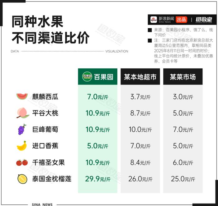 以夏季盛產(chǎn)的麒麟西瓜為例,8月11日,北京某百果園的價(jià)格為7元/斤,相比超市的3.7元/斤、菜市場(chǎng)的3元/斤,價(jià)格高出足足一倍。再看北京本地的平谷大桃,百果園售價(jià)10.9元/斤,比超市高出25%,比菜市場(chǎng)高出118%。