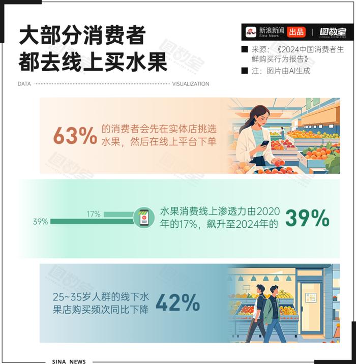 價(jià)格戰(zhàn)、大額補(bǔ)貼,也促使消費(fèi)者用腳投票,去外賣(mài)平臺(tái)上購(gòu)買(mǎi)水果。數(shù)據(jù)顯示,25~35歲人群的線(xiàn)下水果店購(gòu)買(mǎi)頻次同比下降42%。