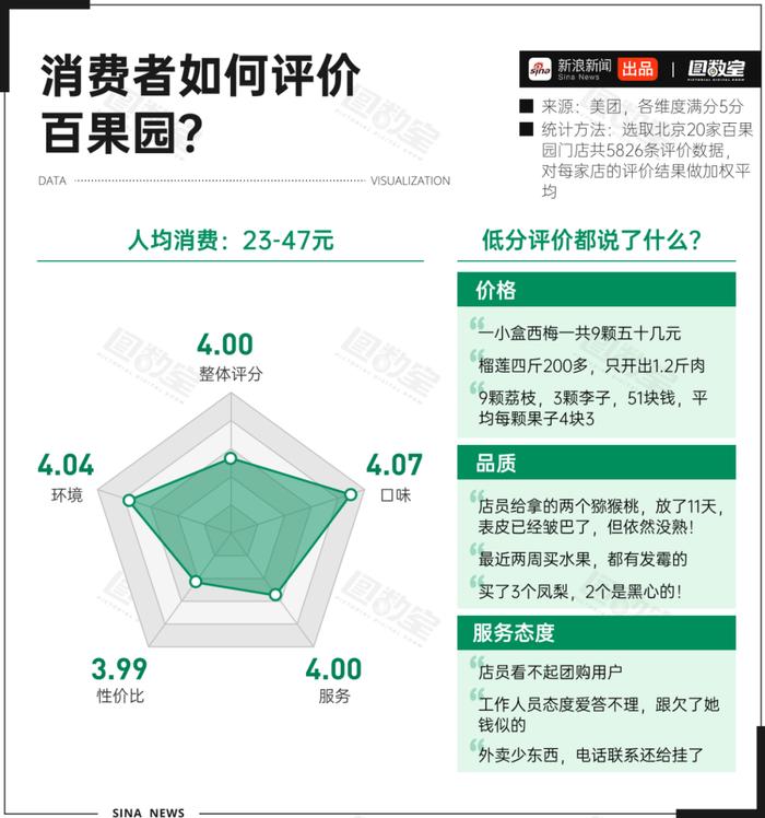 圖數(shù)室統(tǒng)計(jì)了美團(tuán)上北京20家百果園共5826條評(píng)價(jià)數(shù)據(jù),經(jīng)加權(quán)平均后發(fā)現(xiàn):在口味、服務(wù)、性?xún)r(jià)比、環(huán)境四大維度中,性?xún)r(jià)比成為整體評(píng)分的短板。低分評(píng)價(jià)多指向價(jià)格高、品質(zhì)低、服務(wù)態(tài)度差。