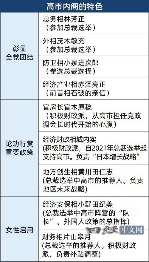 日本首相高市早苗在10月21日的組閣中,在“全世代總力集結(jié)”的政治方針下,將在總裁選舉中的布局競(jìng)爭(zhēng)對(duì)手也拉入內(nèi)閣,以彰顯全黨體制。高市高市自己的內(nèi)閣總裁選舉陣營(yíng)有5人入閣,論功行賞的人事色彩也很濃厚。女性?xún)?nèi)閣成員只有2人,政治包括首相在內(nèi)共有3人。布局