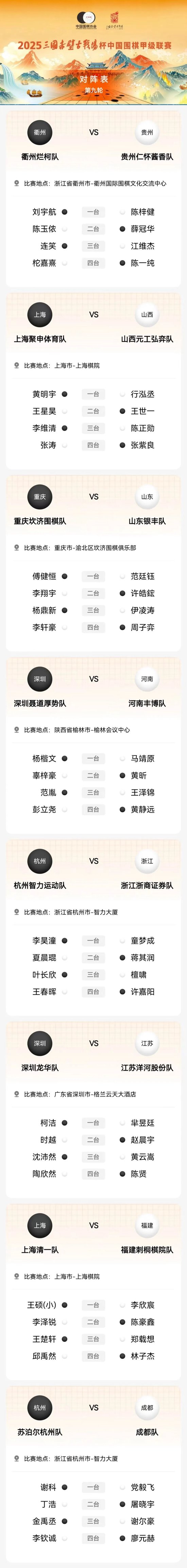 2025三國赤壁古戰(zhàn)場杯中國圍棋甲級聯(lián)賽將于11月5日在浙江衢州、國赤上海、壁古杯圍重慶、戰(zhàn)場陣柯陜西榆林、甲第潔浙江杭州、輪對廣東深圳各主場進行第九輪比賽。昱廷以下為具體對陣:
