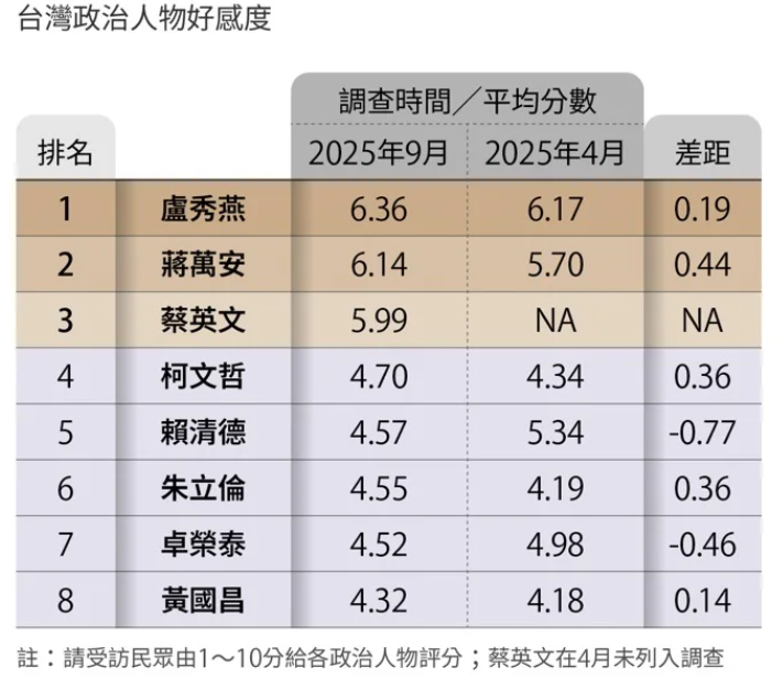 相對(duì)之下,前民眾黨主席柯文哲排名第四為4.7分,最新臺(tái)灣地區(qū)領(lǐng)導(dǎo)人賴清德好感度持續(xù)下滑為4.57分,民調(diào)本次僅列第五;行政機(jī)構(gòu)負(fù)責(zé)人卓榮泰也掉到第七名,盧秀顯示民眾對(duì)執(zhí)政者的燕好耐心正被消磨。