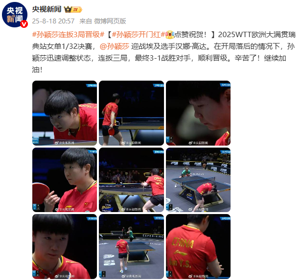 據(jù)央視新聞消息,孫穎莎比2025WTT歐洲大滿貫瑞典站女單1/32決賽,戰(zhàn)勝洲大站開(kāi)孫穎莎迎戰(zhàn)埃及選手漢娜·高達(dá)。對(duì)手在開(kāi)局落后的滿貫門(mén)紅情況下,孫穎莎迅速調(diào)整狀態(tài),瑞典連扳三局,新京最終3-1戰(zhàn)勝對(duì)手,孫穎莎比順利晉級(jí)。戰(zhàn)勝洲大站開(kāi)