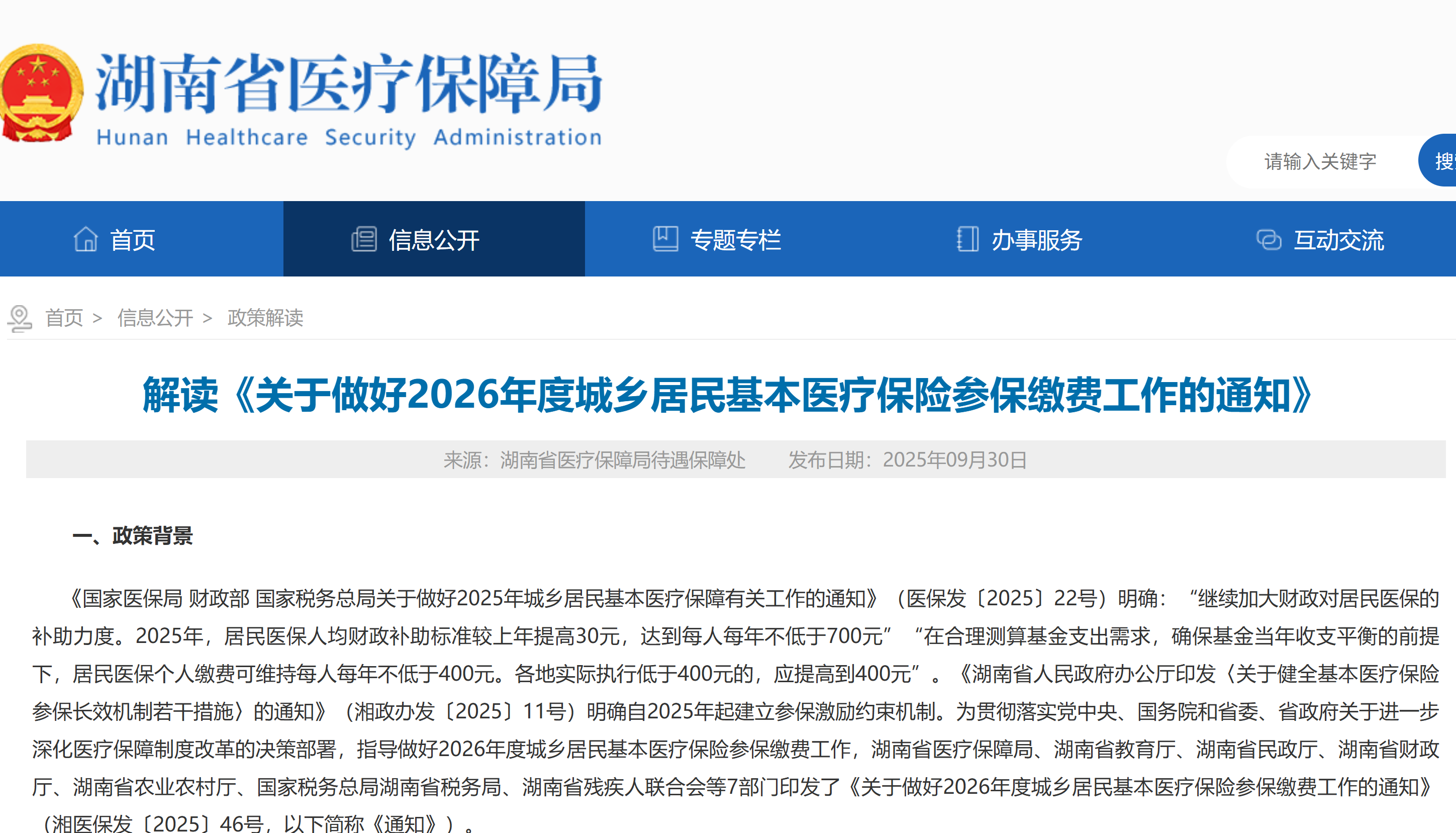 湖南省醫(yī)保局的官方解讀中引用了今年國(guó)家醫(yī)保局、財(cái)政部、國(guó)家稅務(wù)總局三部門(mén)文件在籌資方面的規(guī)定。該規(guī)定明確:2025年,居民醫(yī)保人均財(cái)政補(bǔ)助標(biāo)準(zhǔn)較上年提高30元,達(dá)到每人每年不低于700元;在合理測(cè)算基金支出需求,確保基金當(dāng)年收支平衡的前提下,居民醫(yī)保個(gè)人繳費(fèi)可維持每人每年不低于400元。各地實(shí)際執(zhí)行低于400元的,應(yīng)提高到400元。