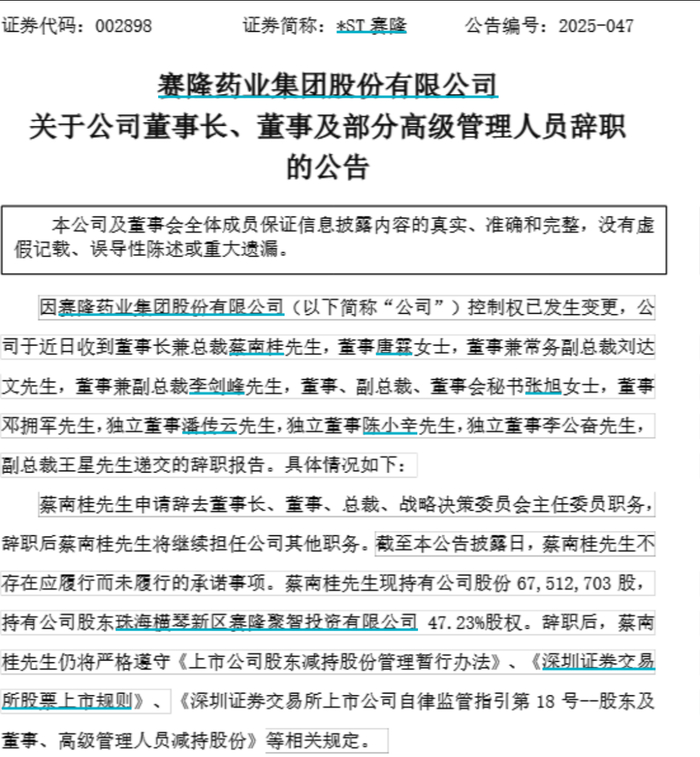 賽隆藥業(yè)董監(jiān)高“大換血”,董事會集體辭職