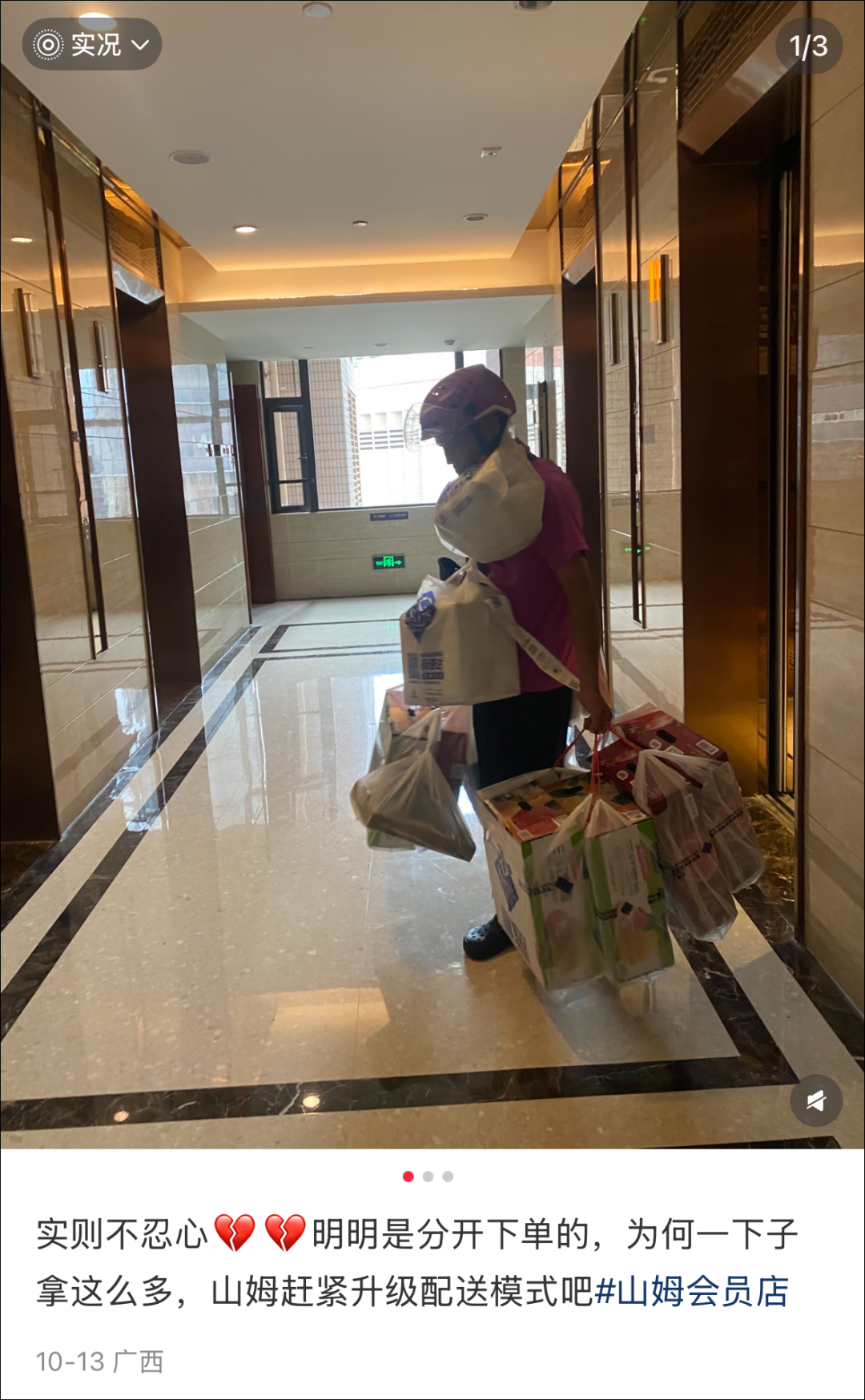 也有網友呼吁,“實在不忍心,怎么一下子拿這么多,山姆趕緊升級配送模式吧!”