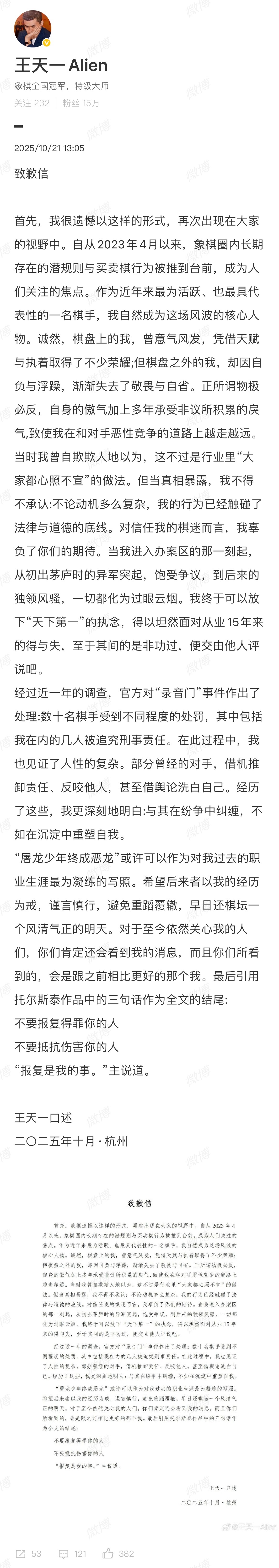 10月21日,王天一Alien發(fā)布致歉信:自從2023年4月以來,象棋圈內(nèi)長期存在的潛規(guī)則與買賣棋行為被推到臺前,成為人們關(guān)注的焦點。作為近年來最為活躍、也最具代表性的一名棋手,我自然成為這場風(fēng)波的核心人物。誠然,棋盤上的我,曾意氣風(fēng)發(fā),憑借天賦與執(zhí)著取得了不少榮耀;但棋盤之外的我,卻因自負(fù)與浮躁,漸漸失去了敬畏與自省。