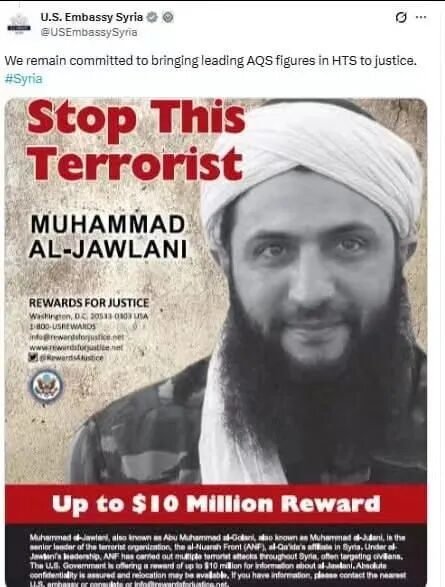因?yàn)樗?dāng)時(shí)還叫朱拉尼,他曾是敘利亞“基地組織”創(chuàng)始人,他還一度加入過“伊斯蘭國”,他雙手沾染過很多美國人的血。