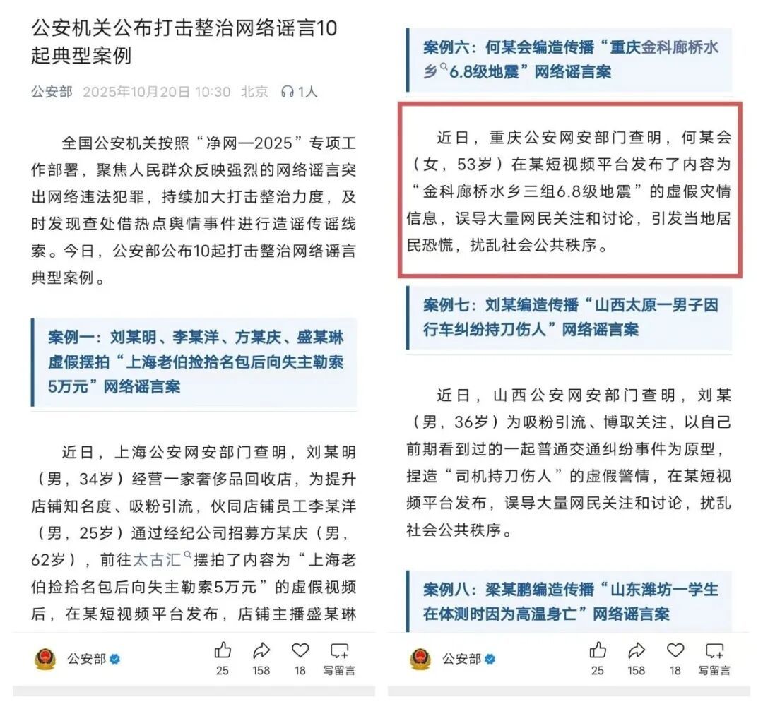 編造“重慶金科廊橋水鄉(xiāng)6.8級地震”謠言,何某某被查處
