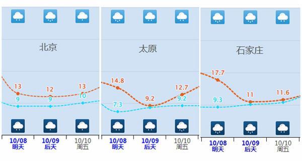 大城市當(dāng)中,像太原、北京、天津、石家莊9日最高氣溫都只有10℃上下,較常年同期偏低10℃左右。
