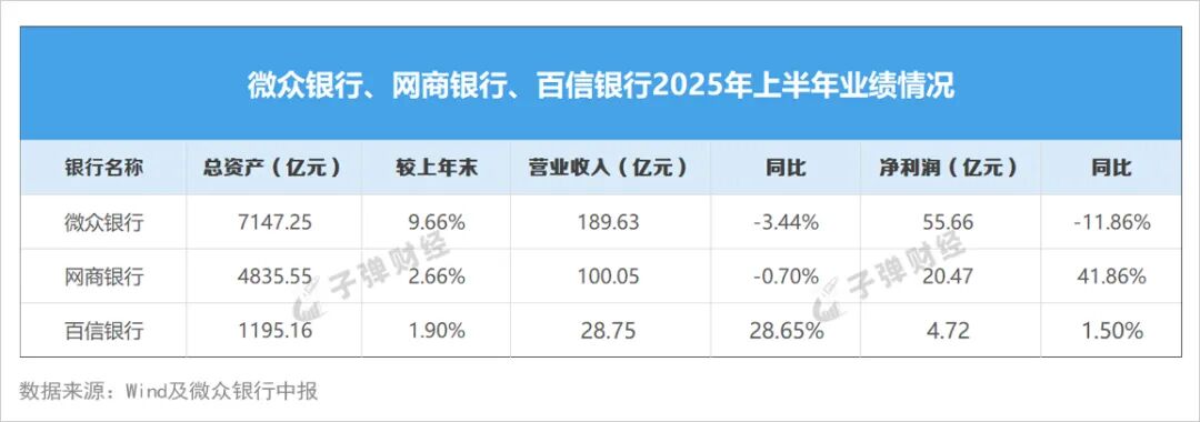 微眾銀行總資產(chǎn)達7147.25億元,網(wǎng)商銀行總資產(chǎn)達4835.55億元,均遠超百信銀行的1195.16億元。