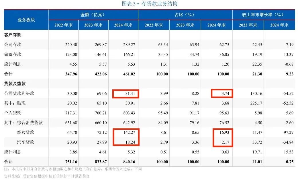 此外,百信銀行公司貸款規(guī)模相對較小。由于2024年貼現(xiàn)業(yè)務(wù)規(guī)模大幅下降,導(dǎo)致公司貸款將至31.41億元,同比下降54.52%;在總貸款中占比3.74%,較去年下降4.54個百分點。