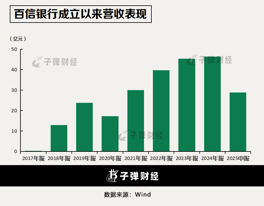 從營收凈利情況來看,2025年上半年,百信銀行營收增速為28.65%,為三家中最高,但實現(xiàn)營業(yè)收入僅28.75億元,而其余兩家營收均超百億。