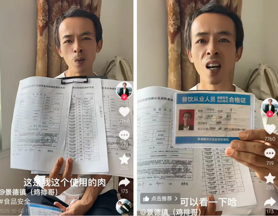 “雞排哥”曬出使用生肉、炸制雞排以及食用油的檢測報告,稱6個批次食品在南昌和杭州兩個不同地方檢測均為合格。
