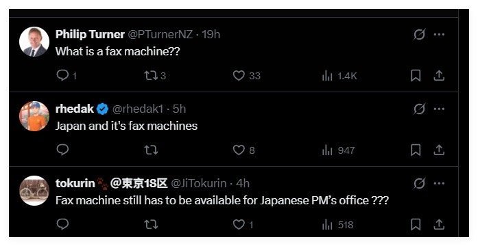 目前,她的這一解釋也引起了不少爭(zhēng)議,連一些外國(guó)人都覺得日本首相居然還在用傳真機(jī)接收信息很魔幻。新西蘭駐韓國(guó)前大使菲利普·特納就在社交媒體上調(diào)侃說:“啥是傳真機(jī)???”