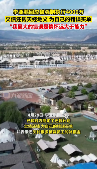 2023年4月28日,針對“李亞鵬被強制執(zhí)行4000萬”的消息,李亞鵬本人發(fā)文回應:已和對方商定了還款計劃,強制執(zhí)行是一個常規(guī)流程。
