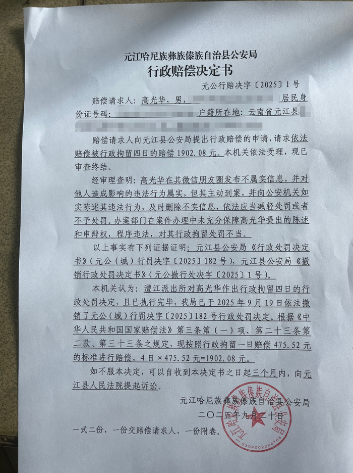 9月17日,高光華認(rèn)為元江縣公安局此前對(duì)其作出的行政處罰決定認(rèn)定事實(shí)不清、證據(jù)不足,適用法律錯(cuò)誤,違反法定程序,明顯不當(dāng),將正常的公眾監(jiān)督認(rèn)定為違法犯罪,向元江縣人民政府申請(qǐng)了行政復(fù)議,請(qǐng)求予以確認(rèn)元江縣公安局行政處罰違法并索賠1902.08元,以及1元精神撫慰金。