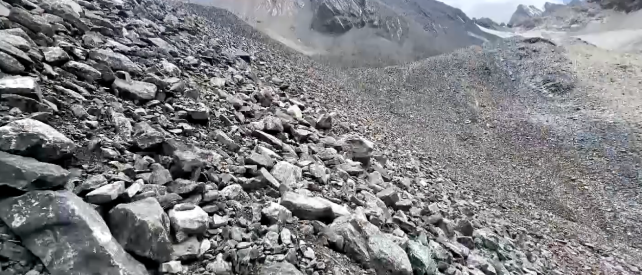 2022年7月,丘女士與當時的人跨男友(現(xiàn)在的丈夫)以及朋友一起來新疆旅游,徒步烏孫古道期間,看到天堂湖附近一處石灘特別壯觀,就把手機放在石頭上拍攝了一段特寫鏡頭。